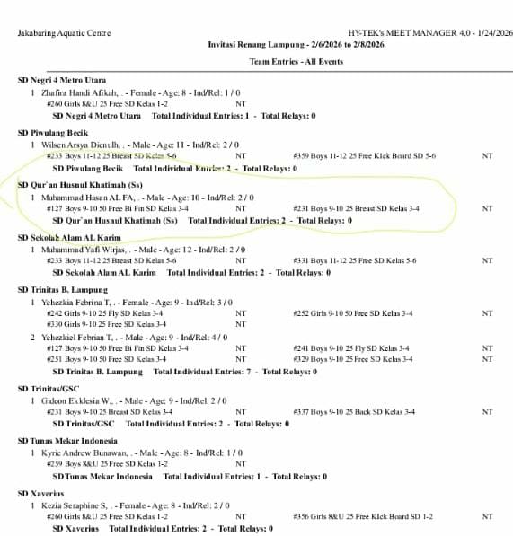 METRO – Prestasi membanggakan datang dari dunia olahraga renang tingkat pelajar. Ananda Muhammad Hasan Al Faruq, siswa dari Sekolah Qur’an Husnul Khotimah Pesawaran, berhasil menyabet gelar Juara 1 dalam ajang bergengsi Orca Fest IV 2026 yang berlangsung di Kota Metro pada Sabtu, 24 Januari 2026.